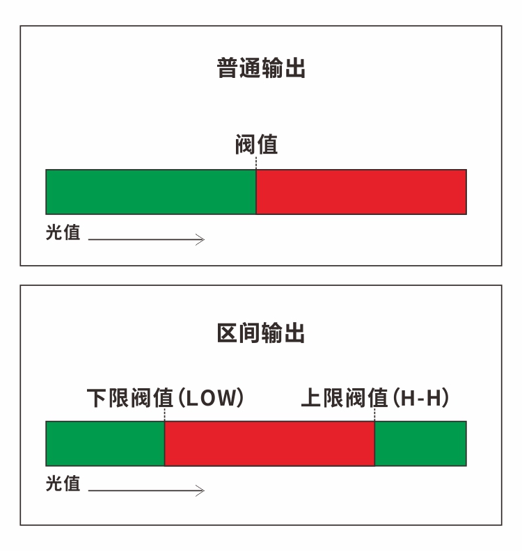光纖放大器普通的檢測輸出方式是設置閥值,光值大于或小于閥值輸出信號,檢測有無。而FG-40-H的區(qū)間輸出功能可以選取光值區(qū)間的中間部分輸出,功能更豐富,可以應對更復雜的場景。