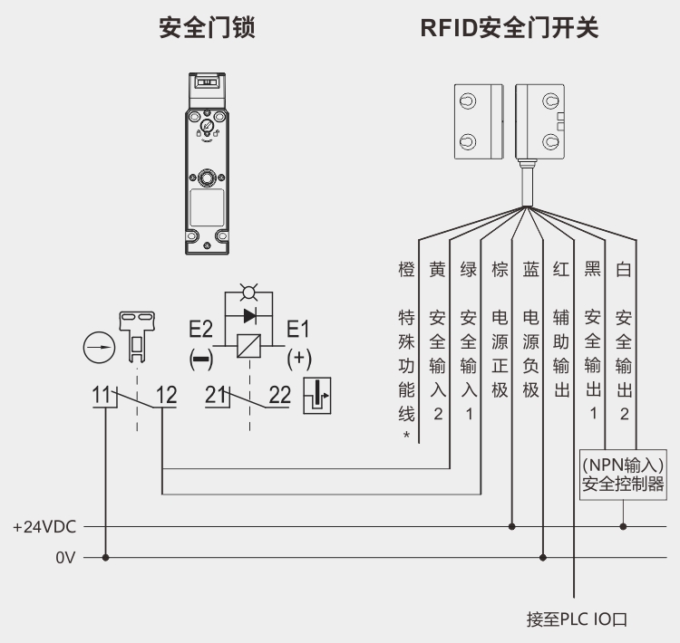 選型時(shí),我們需要關(guān)注鑰匙控制這一項(xiàng),選擇插鑰匙觸點(diǎn)導(dǎo)通的安全門鎖。然后進(jìn)行接線,接線時(shí)根據(jù)非接觸安全門開關(guān)的類型,比如NPN型的,我們?cè)诎踩T鎖的觸點(diǎn)接一邊負(fù)極,一邊接非接觸安全門開關(guān)的信號(hào)輸入線,讓鑰匙插入時(shí)觸點(diǎn)導(dǎo)通,相當(dāng)于導(dǎo)通負(fù)極和開關(guān)的信號(hào)輸入線。下面我們通過圖來了解接線。