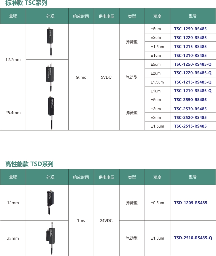 TSD系列有量程12mm和25mm可選,24V DC供電,彈簧款精度可達±0.5um,氣動款精度可達±1um。